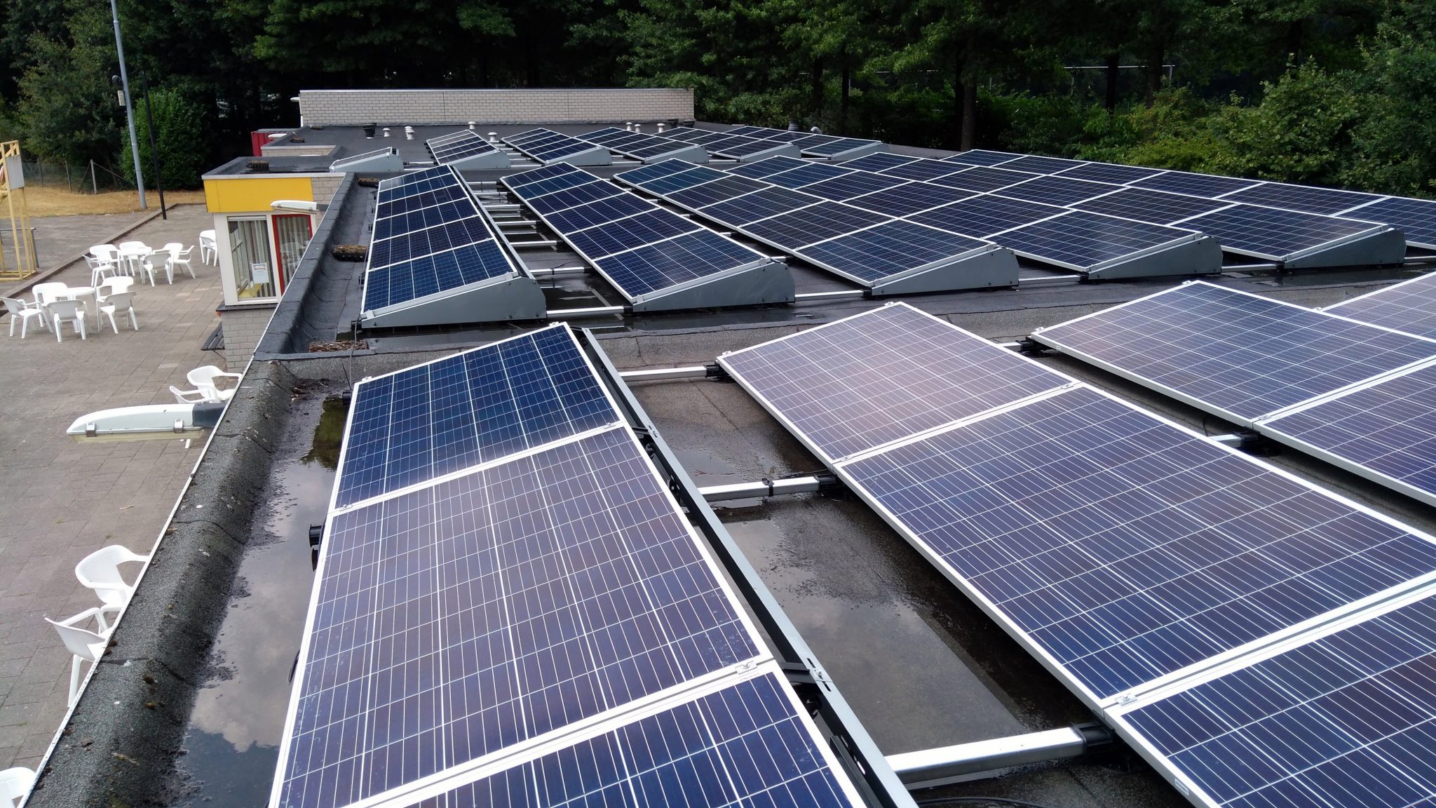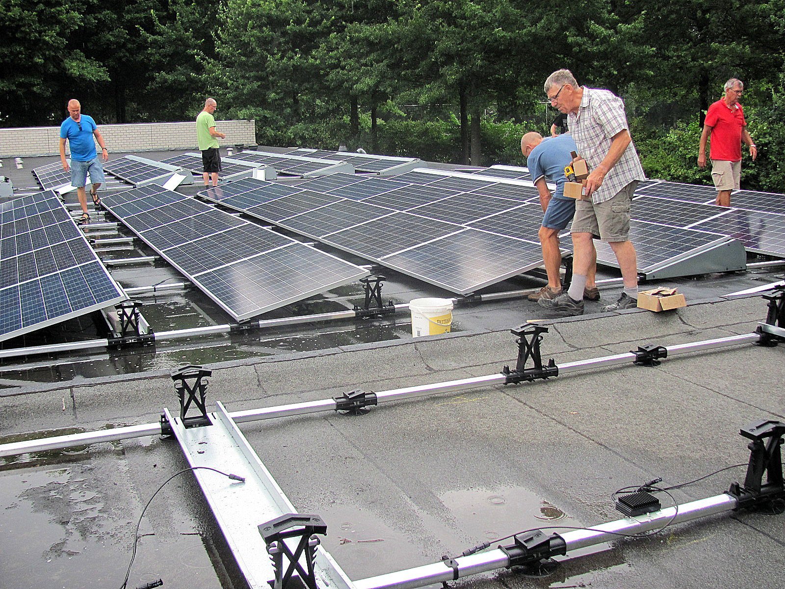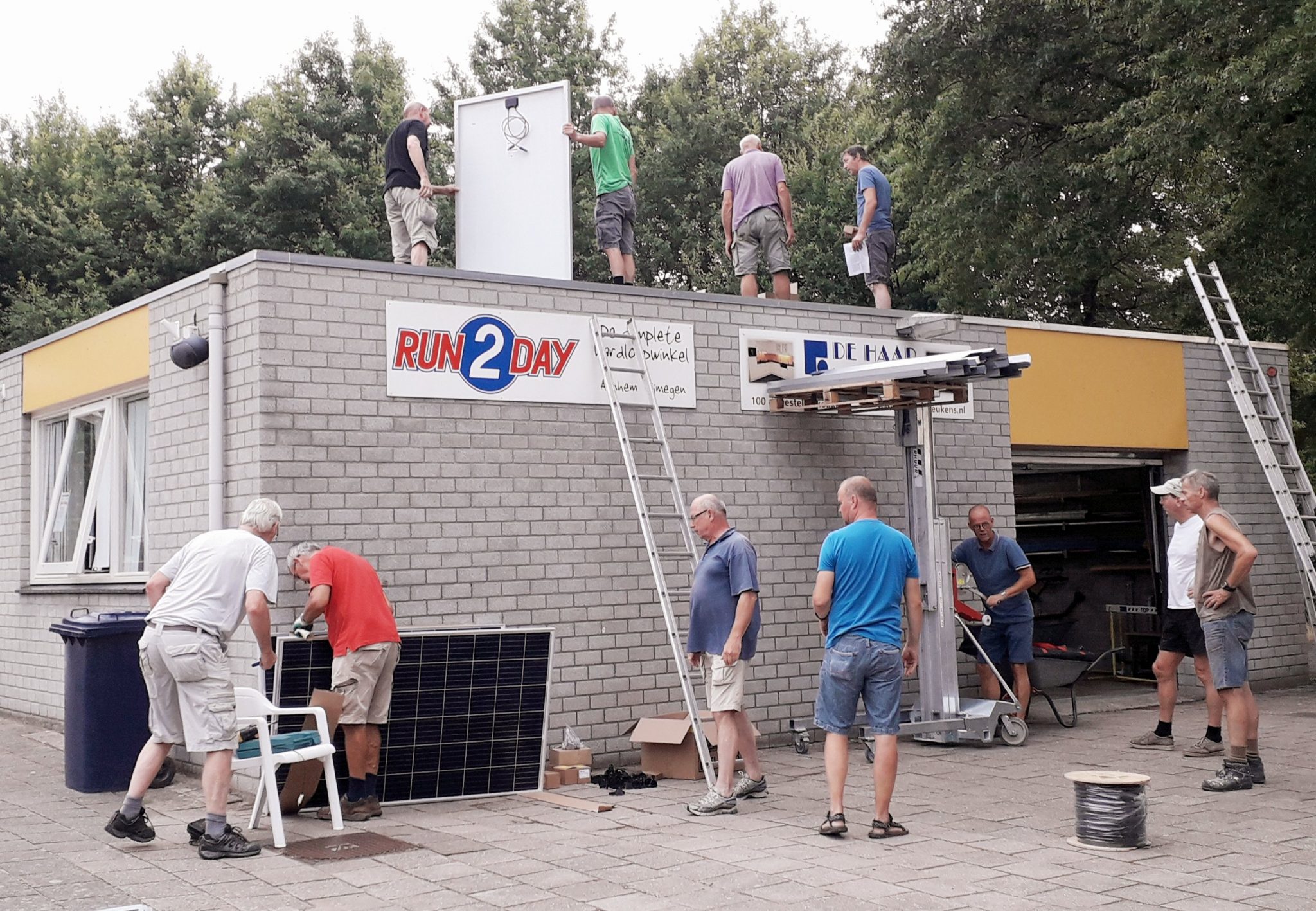Dit alles dankzij de Accommodatie commissie en onderhoudsploeg. Zij hadden in het voorjaar eens kritisch naar de energiekosten gekeken en kregen zo inzicht in het verbruik van gas en elektra. Zodoende kwam men tot de conclusie dat zonnepanelen op het platte dak van het clubhuis, naast het milieu bewuste aspect ook een aanzienlijke besparing zal opleveren. Er werden offertes aangevraagd maar die waren redelijk hoog. Dat kan veel goedkoper vond de werkgroep. Die paar duizend euro voor de installatie kun je besparen door zelf de panelen te plaatsen. Voor het leveren van alle materialen en de uiteindelijke aansluiting werd gekozen voor een onderneming uit Wijchen.