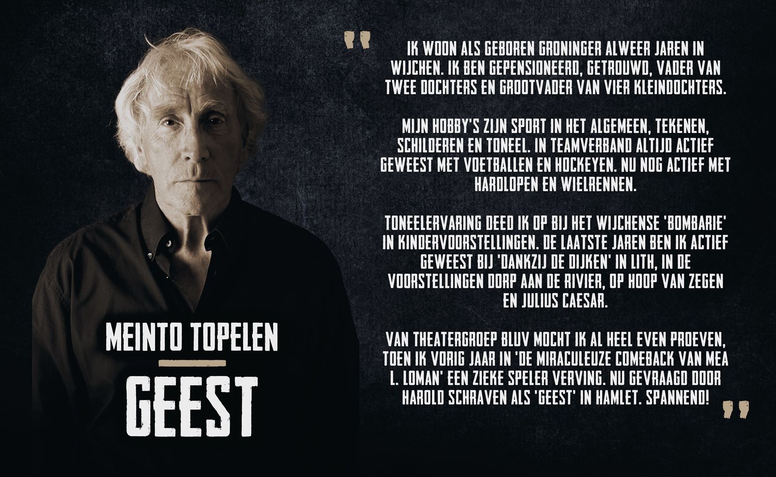 Voor beide heren is het de eerste keer dat ze spelen bij Theatergroep BLUV, hoewel Topelen al eens als gastspeler is ingevallen toen een andere speler ziek was. Toneelervaring hebben ze echter al jaren, eerst bij Bombarie en de laatste jaren eveneens in Lith bij Toneelvereniging Dankzij de Dijken. Van Gemert: ‘Spelen in een klassieker als Hamlet is iets dat iedere acteur op zijn bucketlist heeft staan. Als staatsraad van de koning heb ik een rol die mij uitstekend past; serieus op zijn tijd met bizarre momenten en uitspraken.’