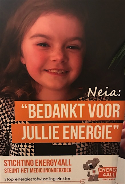 Neia is een vrolijke meid uit Wijchen van 10 jaar oud die kampt met een energiestofwisselingsziekte en waardoor ze snel moe is en veel last heeft van pijn. Elke week worden er in Nederland 1 à 2 kinderen geboren met deze genadeloze ziekte waarvoor nog geen medicijn voorhanden is.