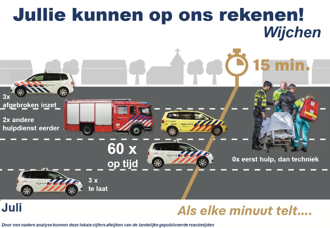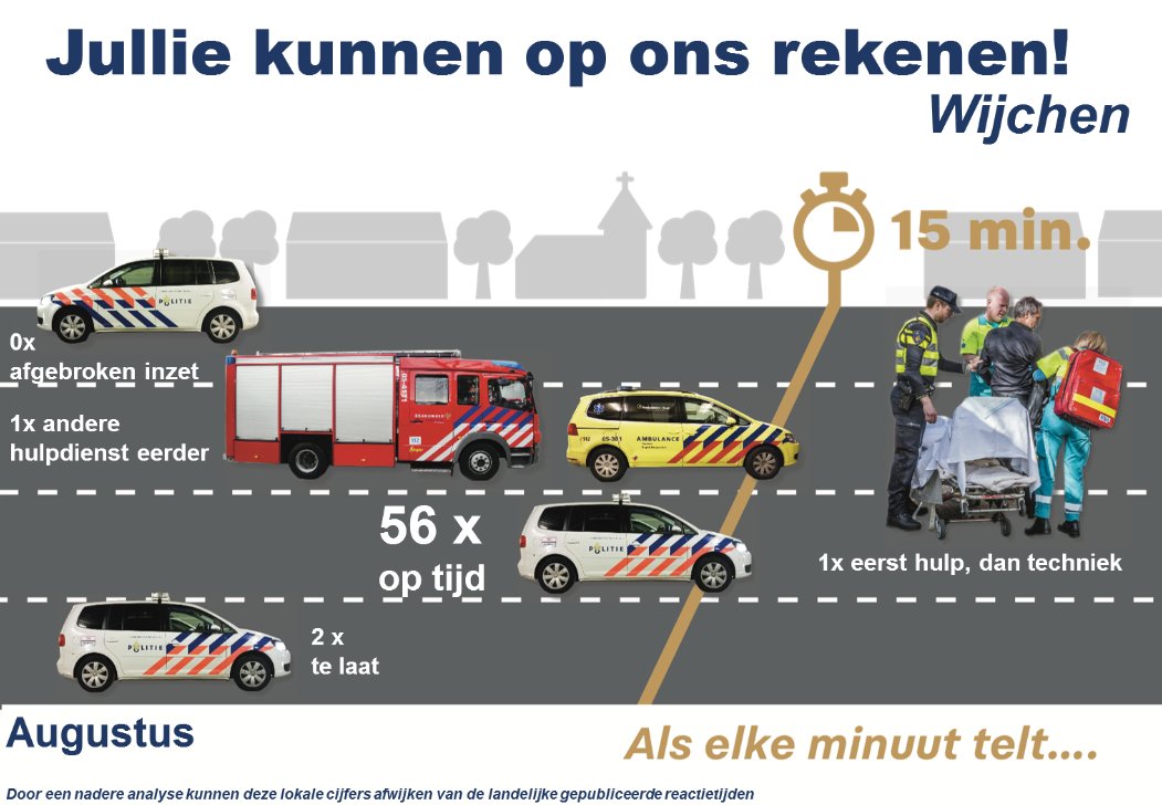 Zoals in de infographics is te zien lukte het de afgelopen twee maanden in de meeste gevallen ook om binnen 15 minuten aanwezig te zijn. Politie Wijchen: "We waren bij 116 spoedmeldingen op tijd. Veel spoedmeldingen waar wij voor in actie komen, gaan over ongevallen of zijn aan gezondheid gerelateerd. In een groot aantal van deze meldingen verlenen we samen met de brandweer of ambulance hulp. In 3 gevallen was de ambulance en/of brandweer er eerder dan de politie en binnen 15 minuten aanwezig om hulp te verlenen.