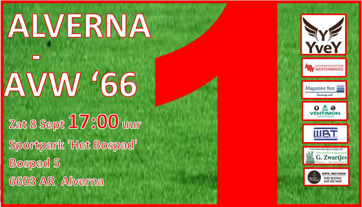 Zaterdag 8 september om 17.00 uur speelt het eerste van Alverna een KNVB-bekewedstrijd tegen AVW'66 uit Westervoort. Moedig de Alvernezen aan!