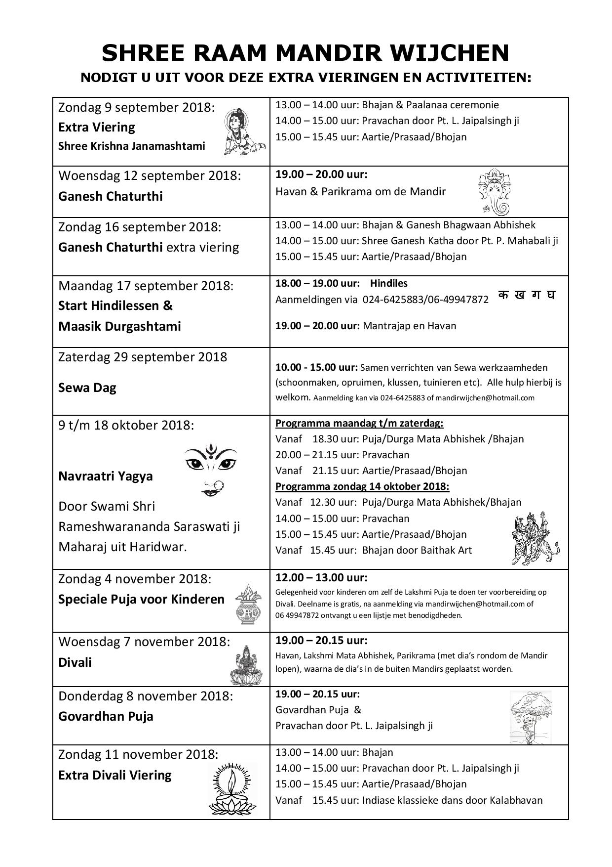 Een overzicht van de activiteiten in de Shree Raam Mandir aan de Stationslaan 18 in Wijchen van september t/m november 2018. Mochten er extra activiteiten gepland worden of wijzigingen plaatsvinden dan zullen die gemeld worden via de website www.mandirwijchen.nl of via https://www.facebook.com/MandirWijchen.