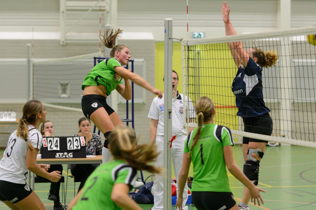 De eerste set begon moeizaam en de Trivos dames keken al snel tegen een 4-9 achterstand aan. Coach Wouter Jansen trachtte met een time-out de rust terug te laten keren aan de kant van Trivos en met succes. Dionne Schreven bracht met een goede servicebeurt de stand weer in evenwicht en er ontstond een gelijk opgaande strijd waarbij van beide kanten om ieder punt werd gestreden. Bij een stand van 18-18 werd de startende spelverdeelster Femke Rongen vervangen door de 14-jarige Sarah van Aalen, om zodoende nog meer blokkerend vermogen aan het net te krijgen. Beide teams streden voor elk punt en uiteindelijk werd de set met 25-23 binnengehaald. Manon Ottjes scoorde het laatste punt met een verwoestende uithaal.