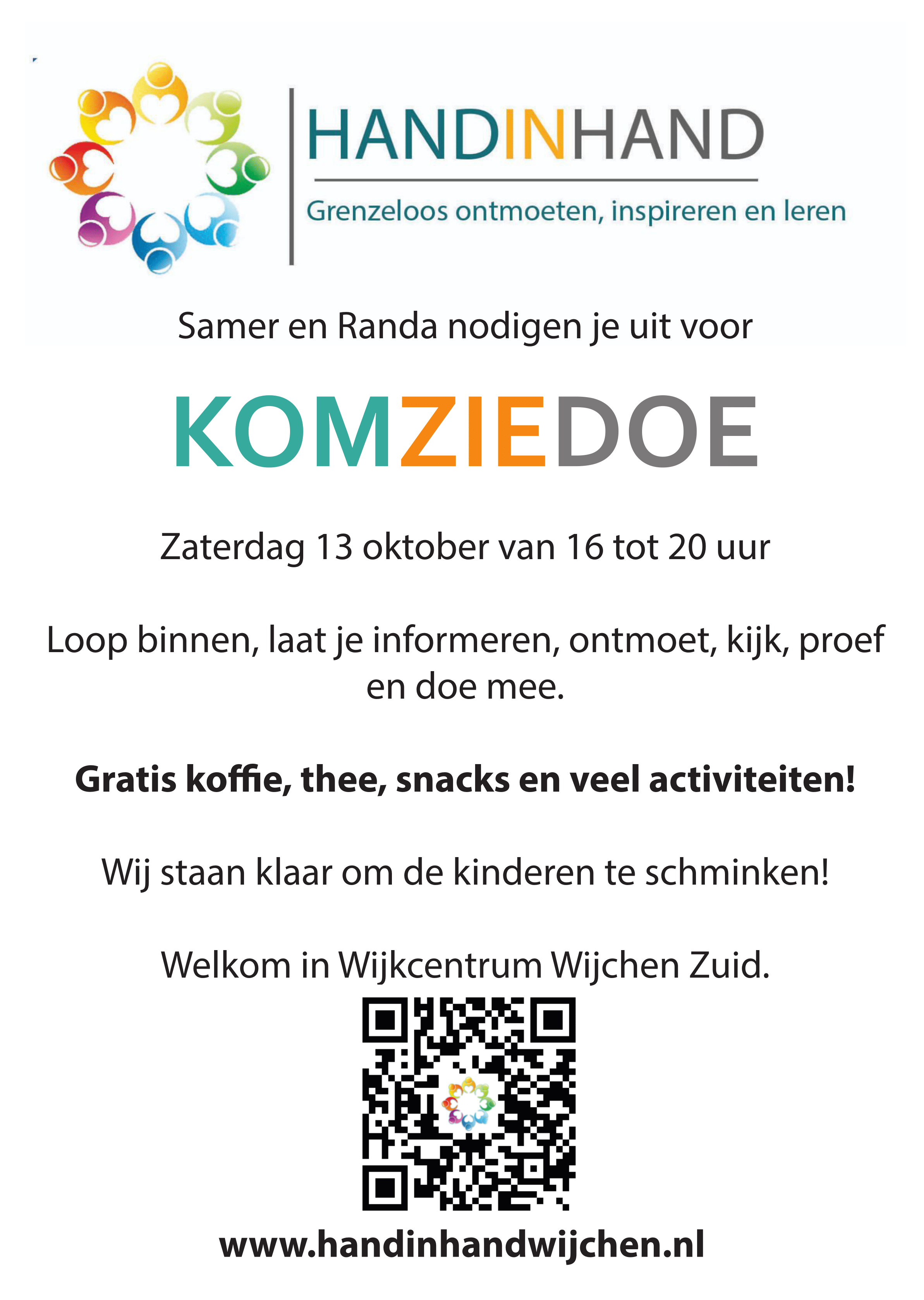 Ze nodigen je uit om op zondag 13 oktober in wijkcentrum Wijchen Zuid/Zuiderpoort te ontmoeten, te kijken, te proeven en mee te doen: KomZieDoe.