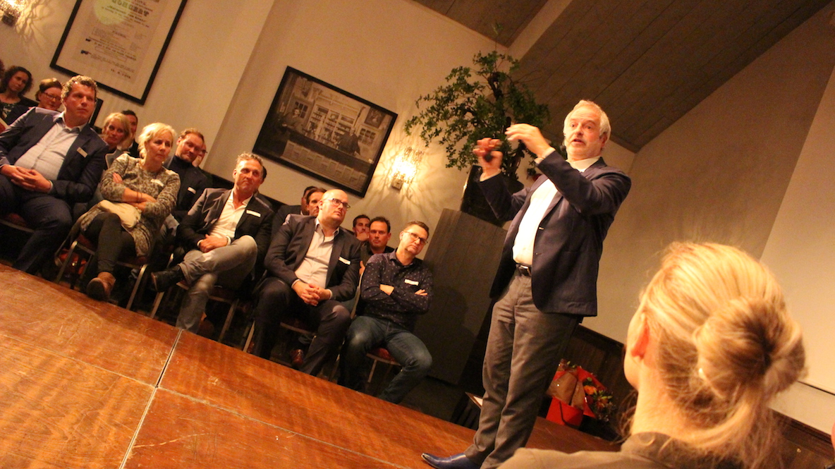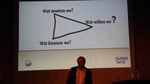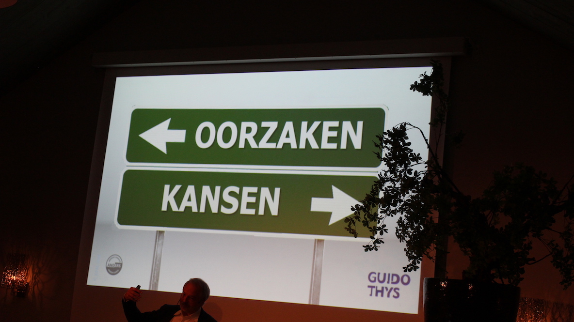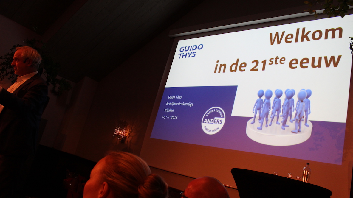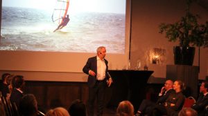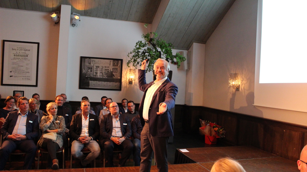 De Vlaamse ‘dwarsdenkende en toch plezante’ gastspreker Guido Thys betrad het podium en nam de ondernemers mee in zijn visie op het ondernemen in de continu veranderende wereld. Hoe bepaal en houd je koers? Guido zette de toehoorders op het verkeerde been, waardoor ze gemakkelijker op een andere manier naar het bedrijf en het ondernemerschap kijken. Kijk niet alleen naar het product als een klant een vraag aan je stelt. Het gaat niet daarom, maar om de vraag er achter en de vraag daar achter. In feite gaat het om de behoefte van de klant. Dus focus je daarop als ondernemer en staar je niet blind op het product dat je levert, want dat zou morgen of overmorgen wel eens achterhaald kunnen zijn. Als je geen meerwaarde biedt als ondernemer dan kiest de klant voor een ander. Dit vraagt om creativiteit en aanpassingsvermogen van de ondernemer, oftewel uit je comfort-zone komen.