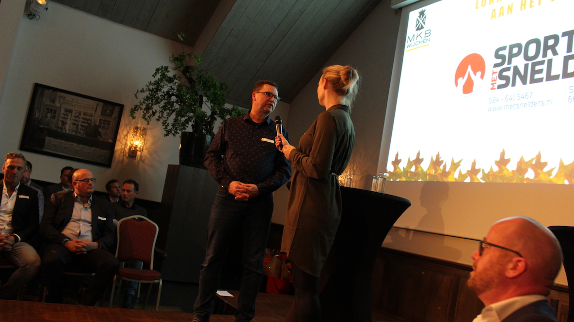 De kracht van MKB Wijchen zit hem onder meer in het verbinden van- en kennisdelen met de lokale ondernemers. Daarom werden drie Wijchense bedrijven op het podium uitgenodigd en geïnterviewd door bestuurslid Linda Jacobs. Zij ging als eerste het gesprek aan met Patrick Dieks van Sport met Snelders. Hij koos er kort geleden voor om afscheid te nemen van de franchise formule van Intersport. Een spannende maar bewuste keuze; Het aangesloten zijn bij een keten biedt zeker voordelen, maar het beperkt je ook in je vrijheid. Onder de eigen naam kan Sport met Snelders zich beter en gemakkelijker specifiek richten op service aan Wijchense sportverenigingen.