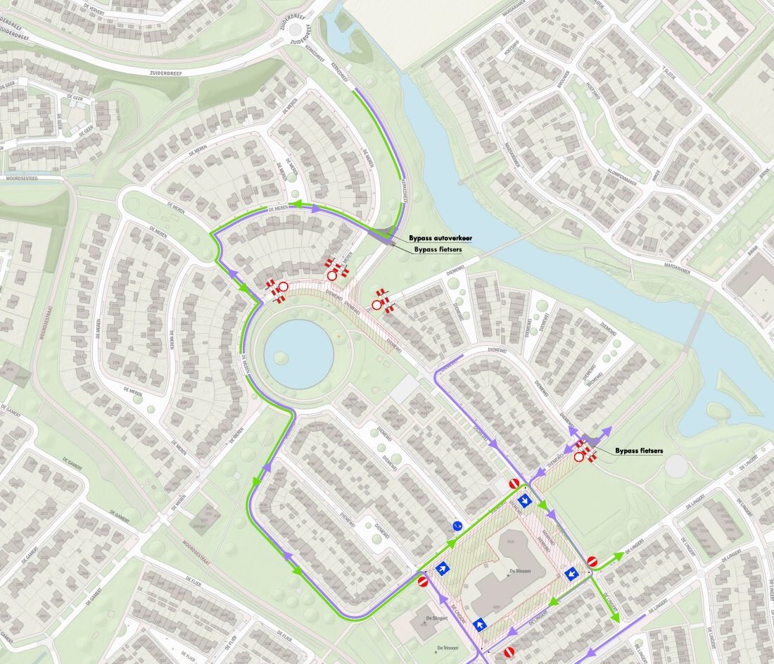 Onderstaande kaart geeft de omleiding weer die in beide richtingen gevolgd moet worden (groene en paarse lijnen). Er komt een tijdelijke weg tussen de Kerkedreef en de kruising de Meren 11de straat/de Meren 12de straat."