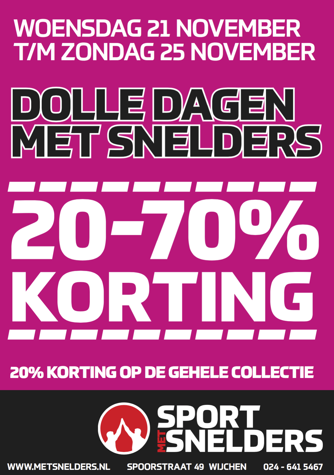 Van woensdag 21 t/m zondag 25 november houdt Sport met Snelders aan de Spoorstraat 49 in Wijchen (tel. 024 - 6415467) Dolle Dagen: tot 70% korting en sowieso 20% korting op de gehele collectie!