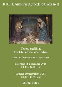 Na het grote succes van de kerststallententoonstelling in 2015, wordt er dit jaar opnieuw een kerststallententoonstelling georganiseerd. Op zaterdag 15 december van 10.00-16.00 uur en op zondag 16 december van 12.00-16.00 uur wordt in de H. Antonius-Abt kerk te Overasselt - onderdeel van de overkoepelende parochie De Twaalf Apostelen - de tentoonstelling ‘Kerststallen met een verhaal’ gehouden. De tentoonstelling bestaat uit meer dan 125 kerststallen, waarvan het verhaal op papier is gezet en bij de betreffende kerststal ligt. Meer dan 90% van de kerststallen is in 2015 niet geëxposeerd. Er zijn kerststallen van verschillende materialen zoals hout, glas, gips, papier en andere materialen te bewonderen. De kerststallen komen vanuit de gehele wereld: uit ons eigen land, uit Zuid-Afrika, Israël, Peru, Mexico en nog veel meer. Verder zijn er ook diverse zelfgemaakte kerststallen te bewonderen. Het verhaal achter de kerststal van de kerk in Overasselt wordt op zaterdag 15 december om 12.00 uur bij de grote kerststal verteld. U bent van harte uitgenodigd om de unieke bij elkaar verzamelde kerststallen te komen bewonderen. De toegang is gratis.