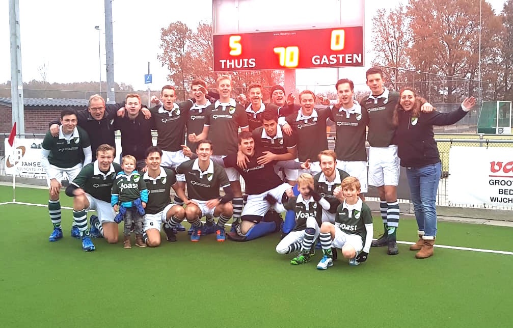 Vlak na de overwinning van het eerste damesteam van Wijchen betraden de heren het veld. Gespannen, maar ook vol vertrouwen, startten zij aan de wedstrijd. Die spanning werd al snel weggenomen. Wijchen overrompelde hun tegenstander en veroverde al direct twee strafcorners vlak achter elkaar. Hugo Fraij scoorde eenmaal met zijn sleeppush. Niet veel later gaf hij een assist op Sjors Reith die de bal majestueus langs de keeper legde. Al binnen 8 minuten stonden de mannen uit Wijchen op een 2-0 voorsprong. De goede start was voor Wijchen geen valkuil dit keer. Zij bleven aanvallen en moesten slechts enkele doorbraken van hun tegenstander toestaan. Vijf minuten voor het einde van de eerste helft zette Tim de Groot, net terug van een langdurige blessure, een sprint in om de bal vlak voor de keeper weg te tikken. Daniël Duijzer gaf vervolg aan de inspanning van zijn teamgenoot door de bal op de plank te slaan. Met een 3-0 voorsprong was de wedstrijd beslist, de tweede helft moest voor de formaliteit nog gespeeld worden.