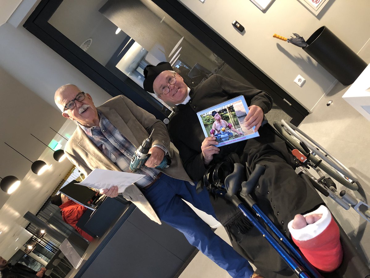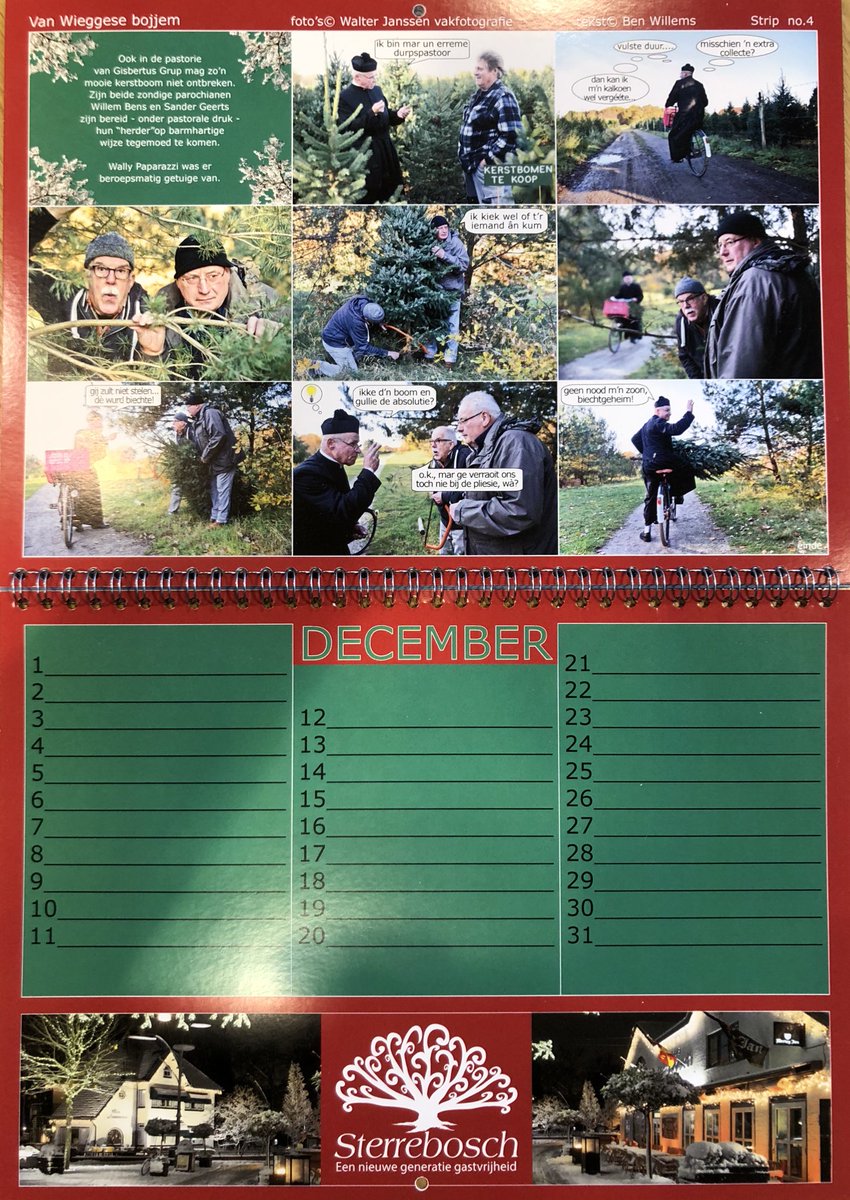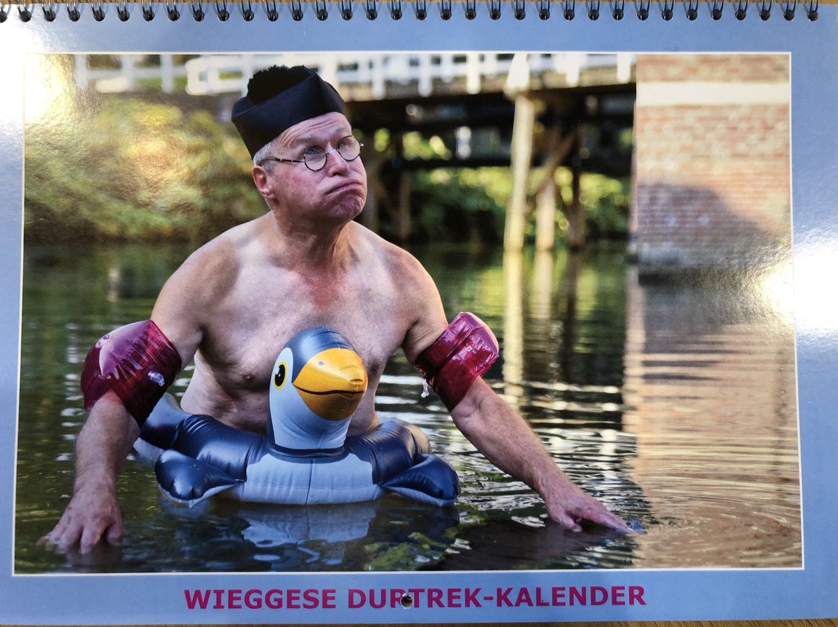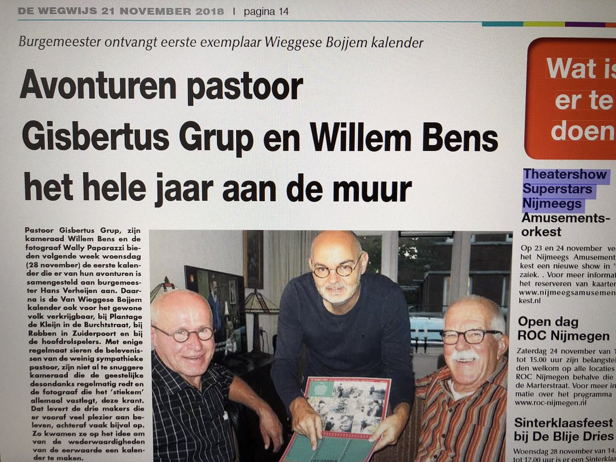Burgemeester Hans Verheijen laat via Twitter weten: "Eerste exemplaar van de Wieggese Durtrek-kalender met de avonturen van pastoor Gisbertus Grup en Willem Bens in ontvangst genomen. Vanaf vandaag te koop bij de makers en Robben (Zuiderpoort) en Plantage DeKleijn (Burchtstraat)."