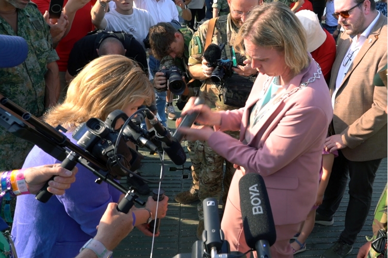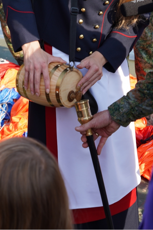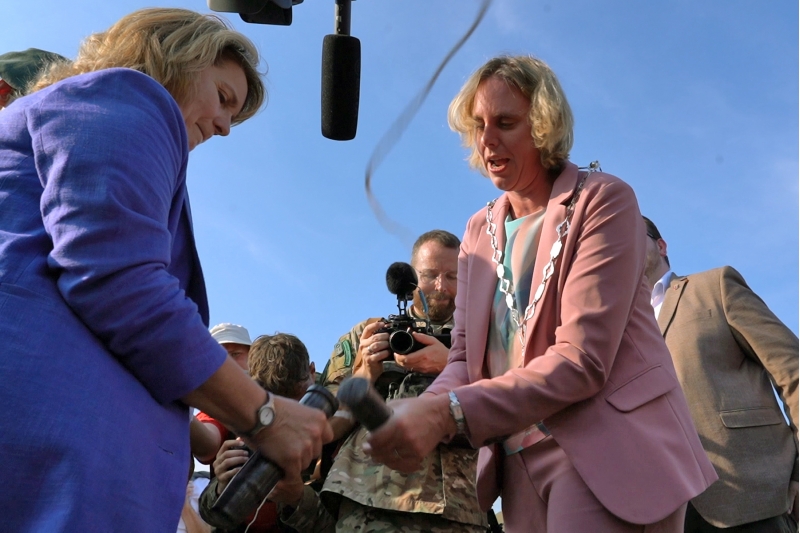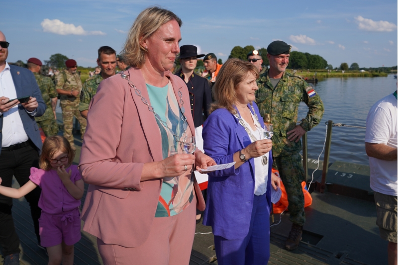 Nadat het laatste laatste deel van de brug vastgezet werd, kwamen vier parachutisten van het militaire parachuteteam uit de lucht. Een voor een landen ze op de brug. Het vliegtuig vloog daarna op zeer lage hoogte over de Maas langs het publiek. Daar kwamen de burgemeesters van Cuijk en Mook en Middelaar elkaar tegemoet op de brug. Zij openden de brug officieel door met twee pennen een touw op het midden door de brug door te slaan. Vervolgens zongen zij het mineurslied mee en brachten een toost op het regiment Genietroepen met een brandewijntje.