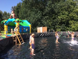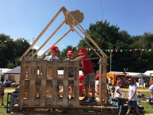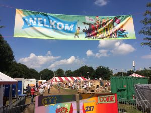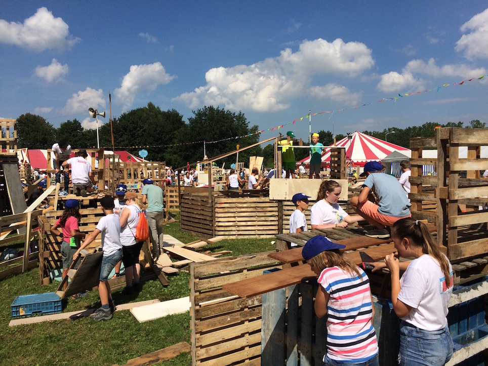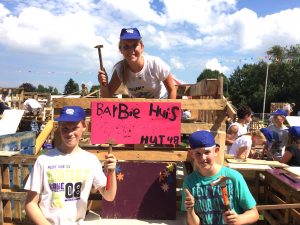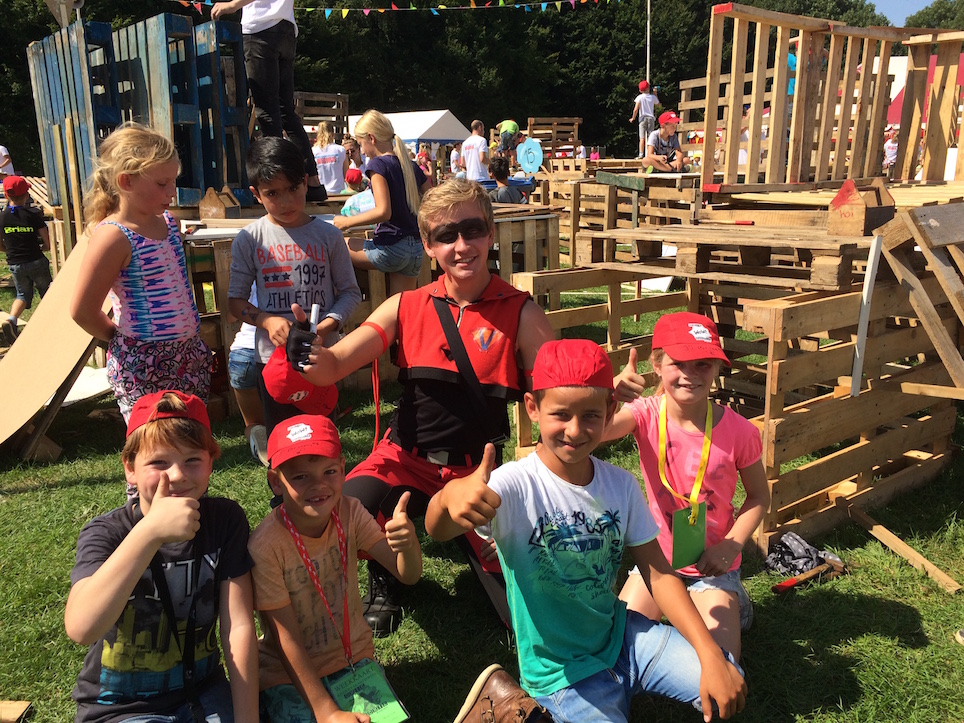 Ja, op dag 1 moet er flink getimmerd en gebouwd worden, want je moet ook de hele week in een mooie hut leven met zijn allen. Als het maar niet gaat regenen of onweren deze week. Nou, de vooruitzichten zijn gelukkig goed! 750 kids en 300 vrijwilligers zijn de jaarlijkse vakantieweek gestart!